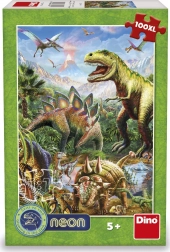 Discover the world of dinosaurs with this amazing neon puzzle! Your child will enjoy fun assembly with neon elements that light up in the dark, displaying the outlines of dinosaurs along with a dramatic mountain range in the background.
