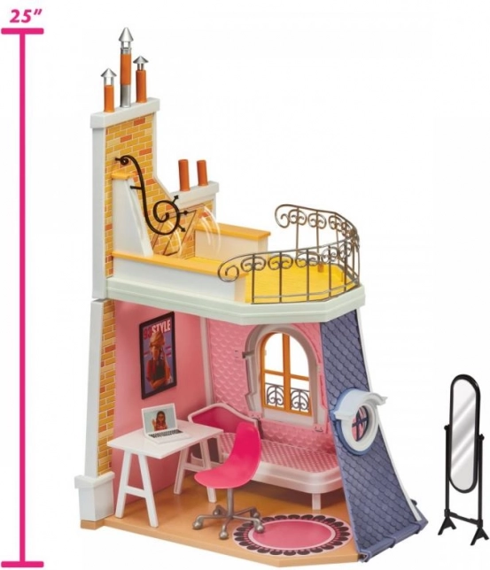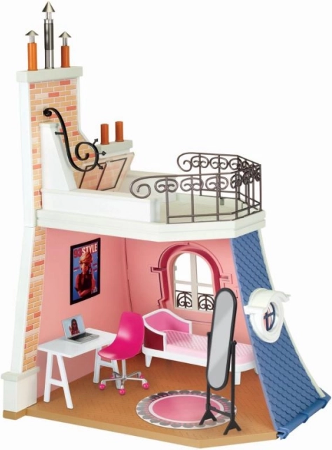 The house is equipped with a terrace on the second floor, adorned with pink walls and railings, adding another dimension to the play.