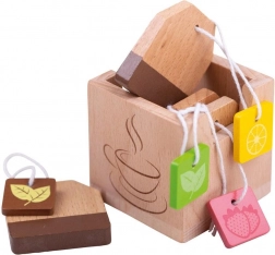 Invite friends to a tea party with the BIGJIGS TOYS wooden tea bags set. Children can choose from lemon, strawberry, and mint flavors, all stored in an elegant wooden box. The toy encourages imaginative play, develops fine and gross motor skills, and teaches social skills. Made from high-quality responsibly sourced wood, it meets European safety standards.