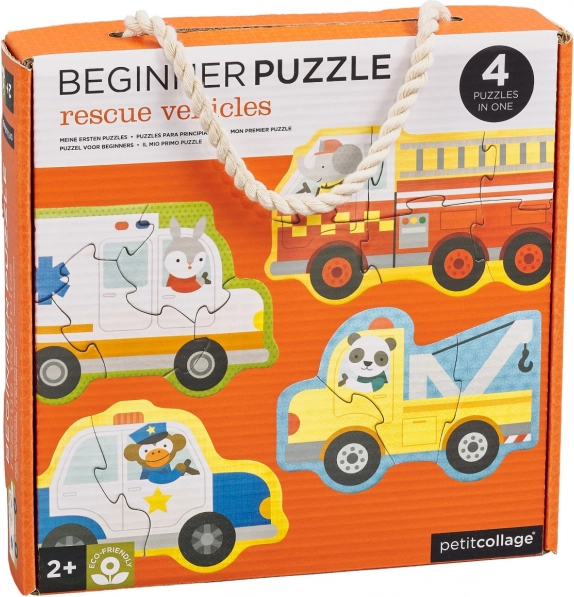 Set of 4 Petit Collage kids' puzzles featuring rescue vehicles. 3–6 pieces, ages 2+, recycled cardboard with plant-based inks, in a practical box.