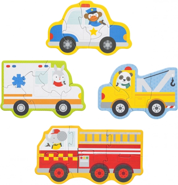 Introduce children to the world of first responders with charming illustrations—a rabbit drives the ambulance, a monkey the police car, an elephant the fire engine, and a panda the tow truck. The varying difficulty levels (3, 4, 5, and 6 pieces) support gradual skill development, patience, and the joy of success.