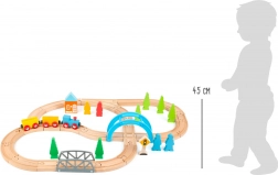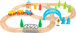 The set includes a locomotive with carriages, a bridge, a little house, trees, figures, and traffic elements for realistic scenarios. Natural wood combined with bold colors looks attractive and supports sensory perception. Thanks to compatibility with other wooden systems, children can easily expand their world of rails.