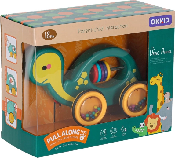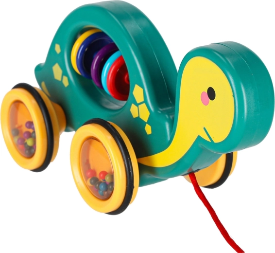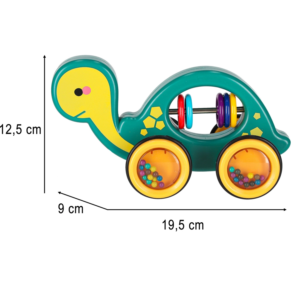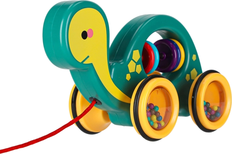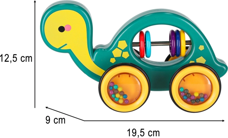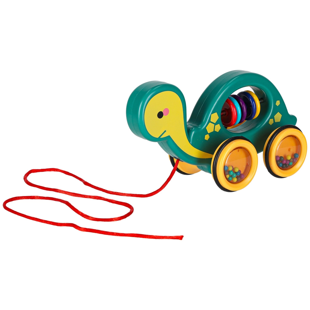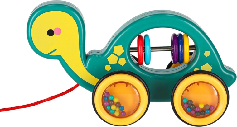 This cheerful pull-along turtle is a perfect companion at home or on a walk. Thanks to the string, a child can easily lead it, while the transparent wheels with colorful beads make a pleasant rattle and motivate movement. The toy supports the development of gross and fine motor skills and hand–eye coordination as well as understanding of cause and effect.