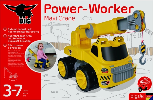 A robust ride-on – the BIG Power Worker maxi crane – brings kids realistic construction fun. It offers a 360° rotating tower, a functional boom with a durable cable winch (pulling force up to 450 g), metal axles, and soft, non-marking tires. Thanks to front and rear anti-tip protection and a load capacity of 50 kg, it is safe for play both indoors and outdoors. Made in Germany.