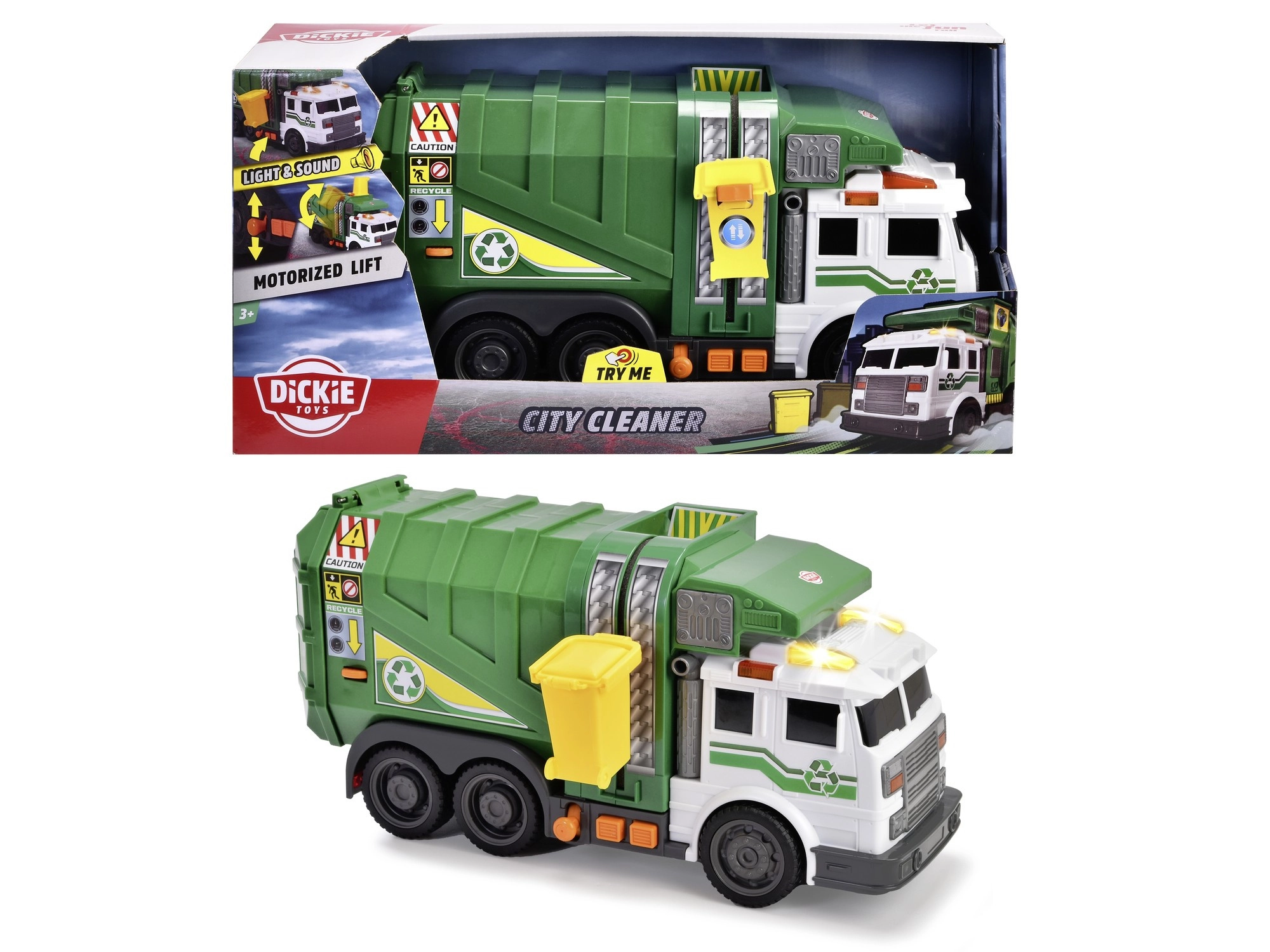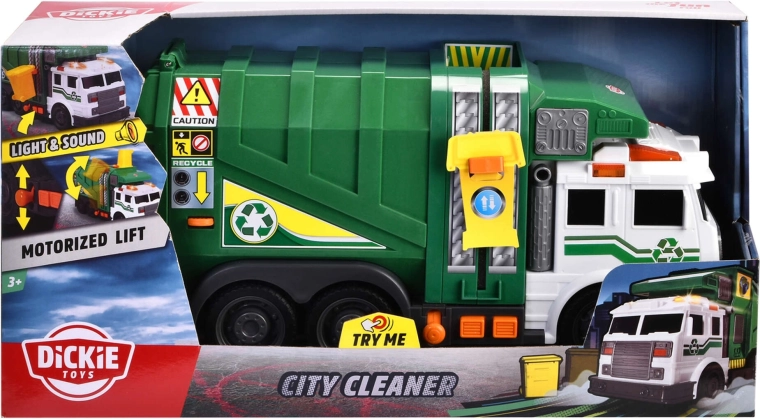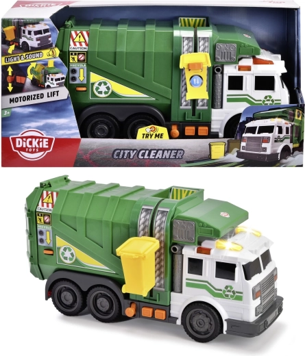 The realistic green City Cleaner garbage truck by Dickie Toys delights kids with lights and sounds, a functional lift for the yellow bin, and moving parts. A great toy for pretend waste collection, learning about recycling, and developing fine motor skills.