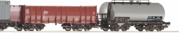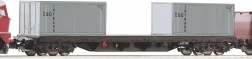 The consist includes container flat cars, an open wagon, and a tank car for an authentic mixed freight and flexible consists.