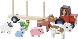 The cheerful wooden VILAC tractor with a detachable trailer and six cute animals (rabbit, sheep, rooster, horse, pig, cow) is an ideal toy for children from 2 years. By placing the figures and driving with the trailer, kids practice hand–eye coordination, patience, and imagination.