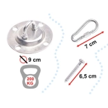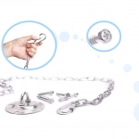 A ceiling hook, carabiners, chain, and screws allow safe, quick hanging without buying extra parts.