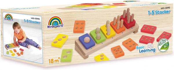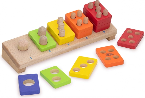 Each colored piece has the number of holes that matches the number on the base. Children naturally practice numbers 1–5 and comparing quantities.