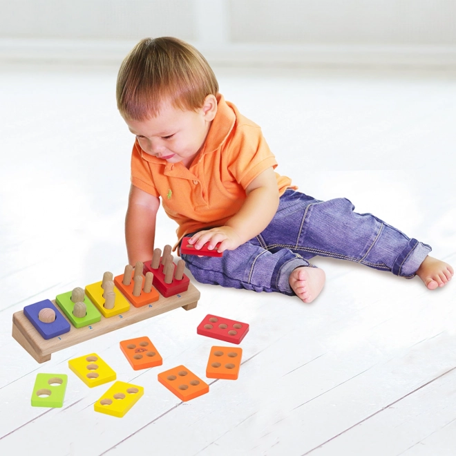 This high‑quality wooden educational toy naturally teaches children to recognize colors and understand the number order 1–5. Each tile has a matching number of holes, and children thread them onto the pegs in the base, practicing counting and logical thinking.
