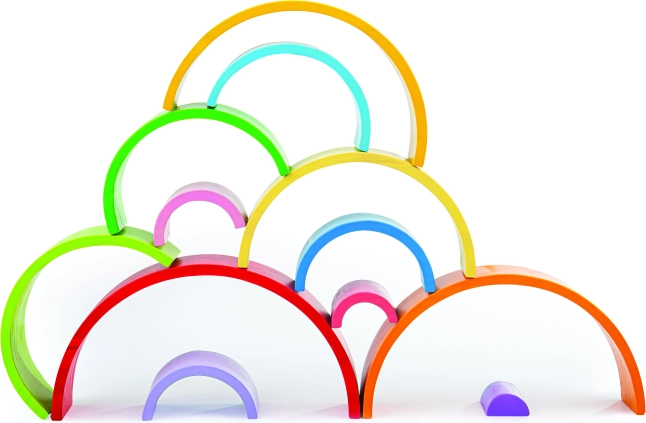 12 colorful arches offer endless combinations — from bridges and tunnels to abstract structures. Encourages imagination and independent play.