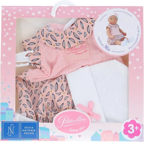 Mia Outfit for dolls by Petitcollin brings French elegance and unique patterns. This set is ideal for dolls with a height of 35 cm and includes a jumpsuit, a hat, and socks.