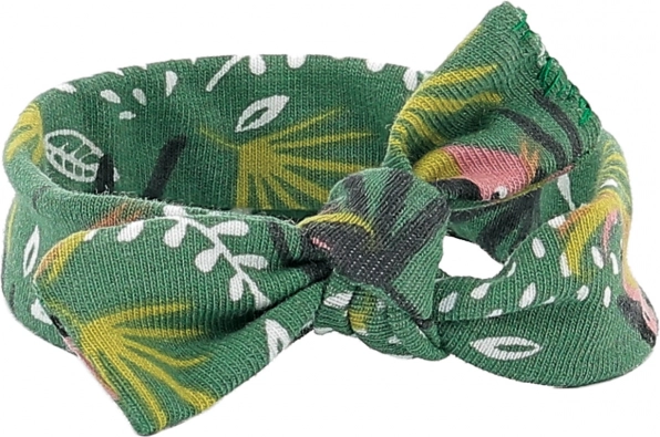 The fabric headband with a tropical print and knot keeps its shape and harmonizes beautifully with the other pieces.