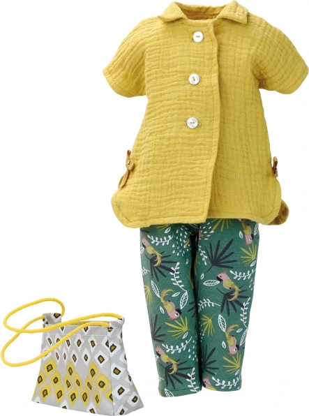 Green trousers with motifs of tropical plants and birds give the doll a fresh and playful look. The pattern pairs beautifully with the ochre blouse.