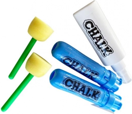 The set contains 10 chalks, 2 holders, letter stencils, 2 sponges, and a water spray. Everything needed for fun and creative drawing.