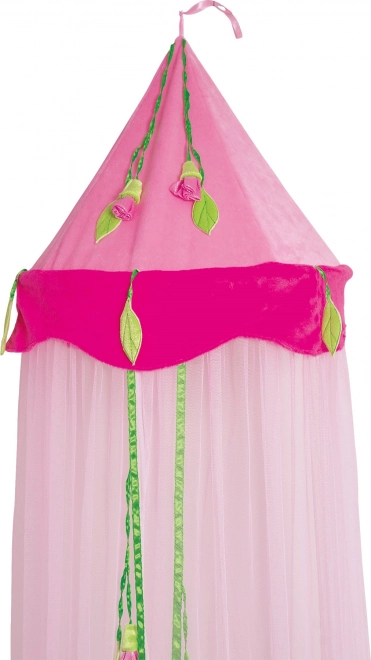 This canopy is adorned with various roses and green leaves, giving any room a playful yet elegant appearance.