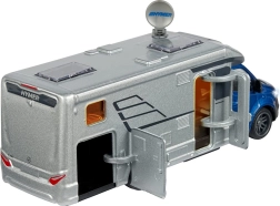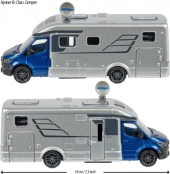 The model is officially licensed by HYMER and MERCEDES-BENZ and offers an appealing combination of interior and exterior lighting and 2 realistic sounds — nature and engine — activated by pressing the hood. Opening doors, a rotating satellite antenna, and treaded tires provide smooth rolling and lots of play scenarios at home or on the go.