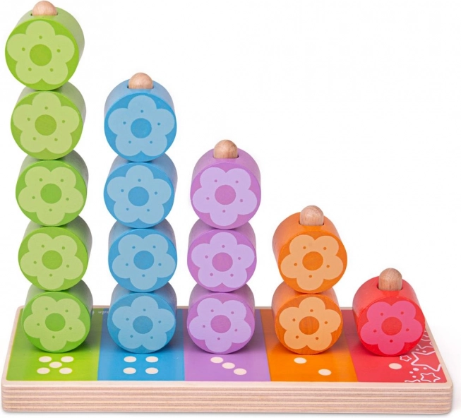 A cheerful wooden educational toy that teaches children to recognize colors, count from 1 to 5, and practice fine motor skills. The colorful flowers easily stack onto numbered pegs, supporting hand–eye coordination and concentration. Made from quality wood and compliant with European safety standards.