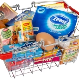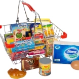 Metal shopping basket, plastic food mock-ups (selection varies)