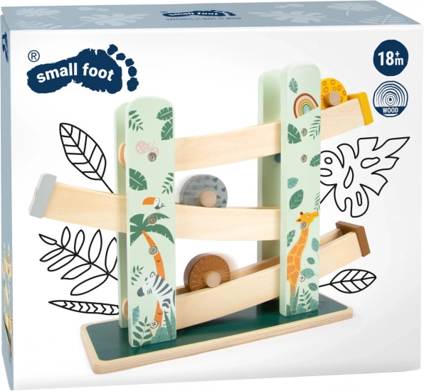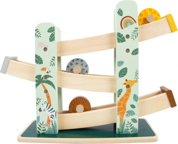 This beautiful wooden track offers children the opportunity to watch as three wheels, each with a unique design, roll down the three ramps. It is decorated with illustrations of animals living on safari and plants from the jungle.