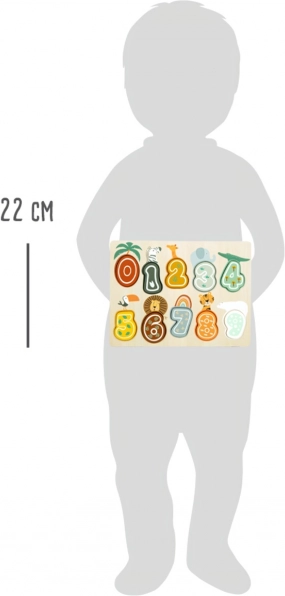 This educational wooden puzzle in pastel colors combines the joy of play with learning. Children can easily grasp and place 10 raised wooden digits into the correct cutouts, developing fine motor skills, hand–eye coordination, and logical thinking. Colorful safari animal illustrations spark imagination and keep attention.