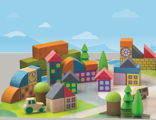 - 40 wooden blocks + play mat for building a village