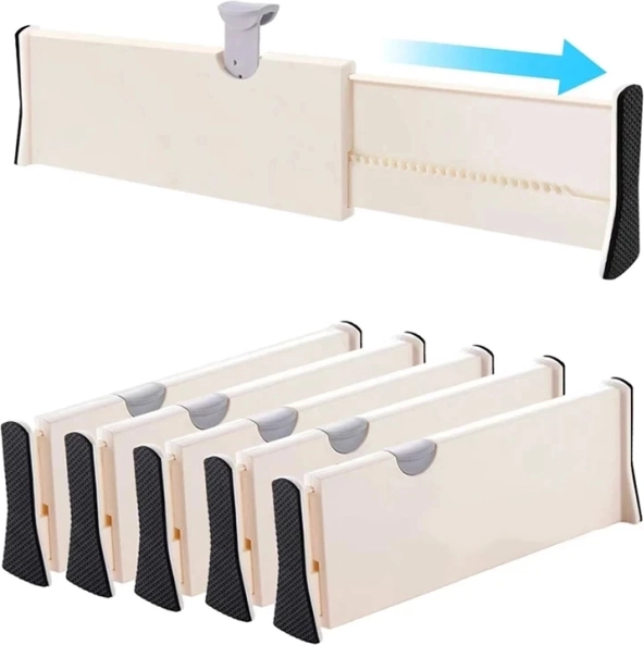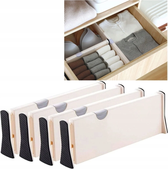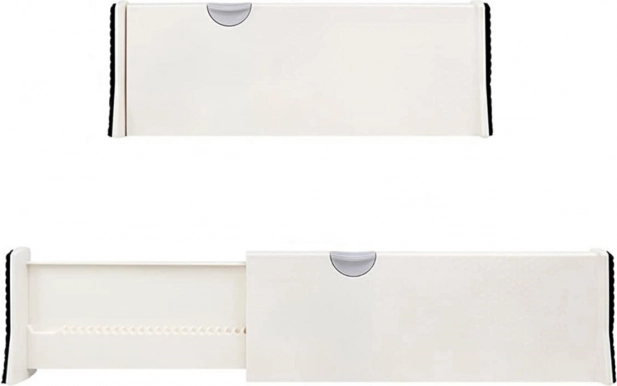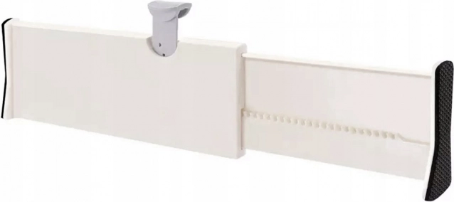 A very practical expandable drawer organizer. The divider lets you easily and affordably organize your cosmetics or underwear collection and split a drawer into two sections of any size. Thanks to the folding and unfolding range from 28 cm to 43 cm in width and a sturdy locking mechanism, the partition fits perfectly into the drawer.