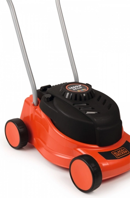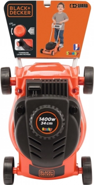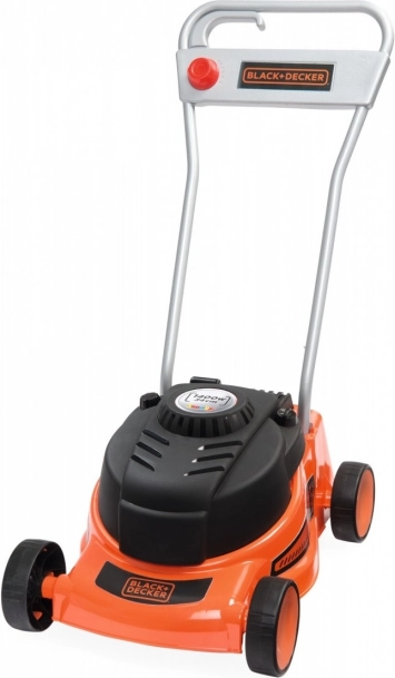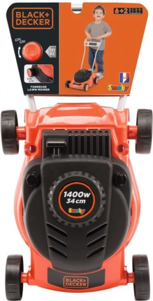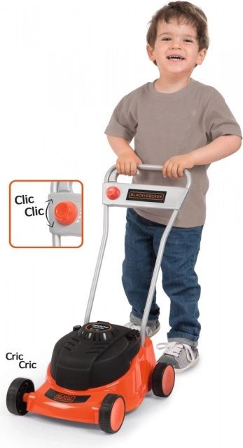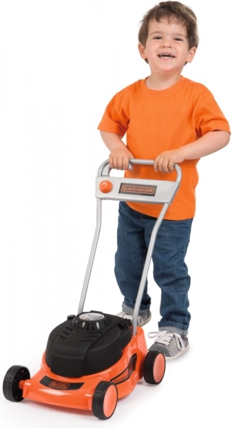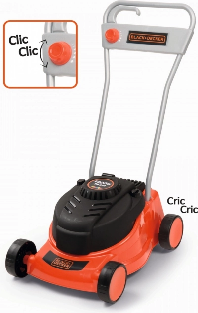 The mower makes a sound effect reminiscent of a real lawn mower when moved. Additionally, it features a turning knob to simulate speed regulation.