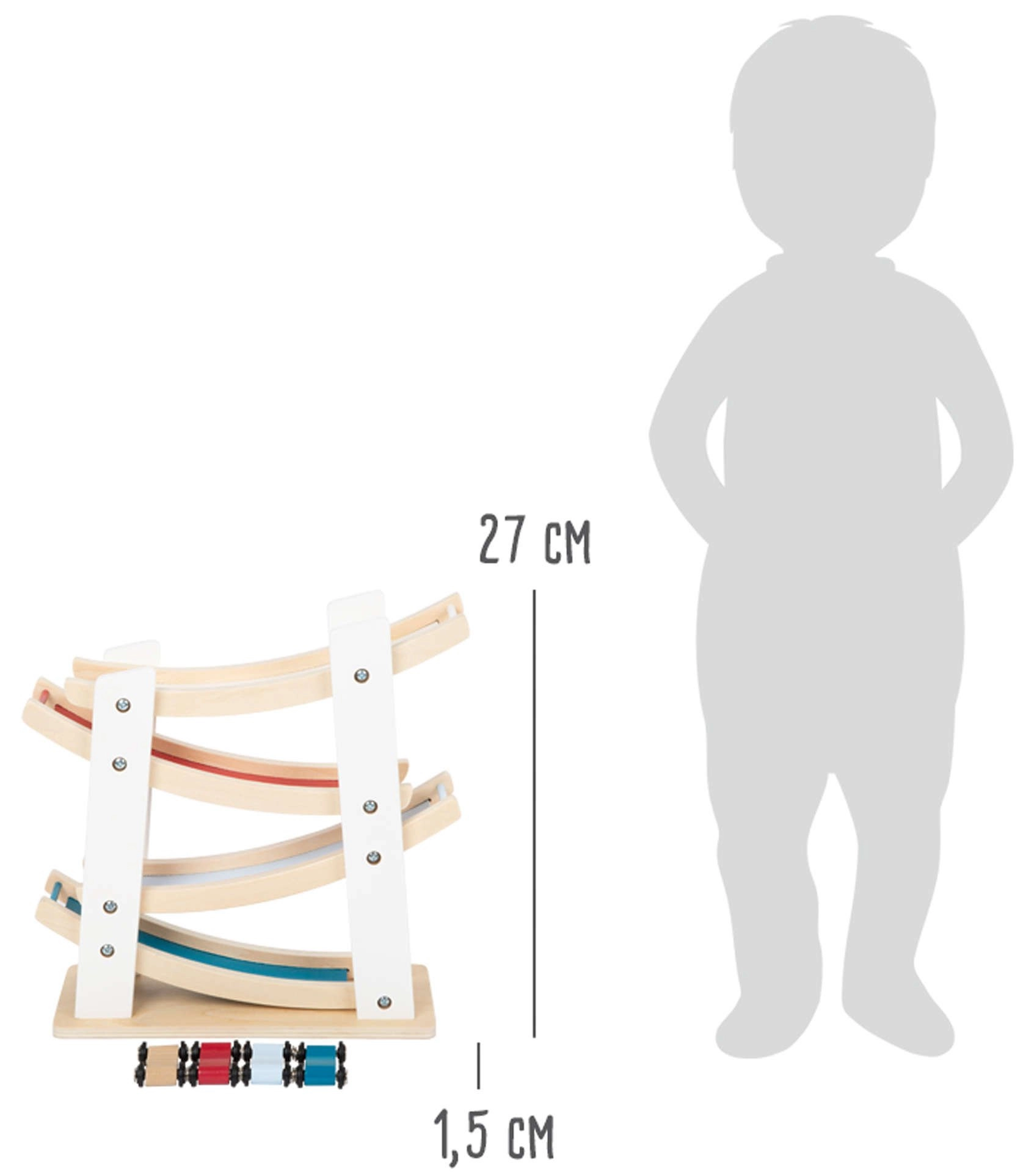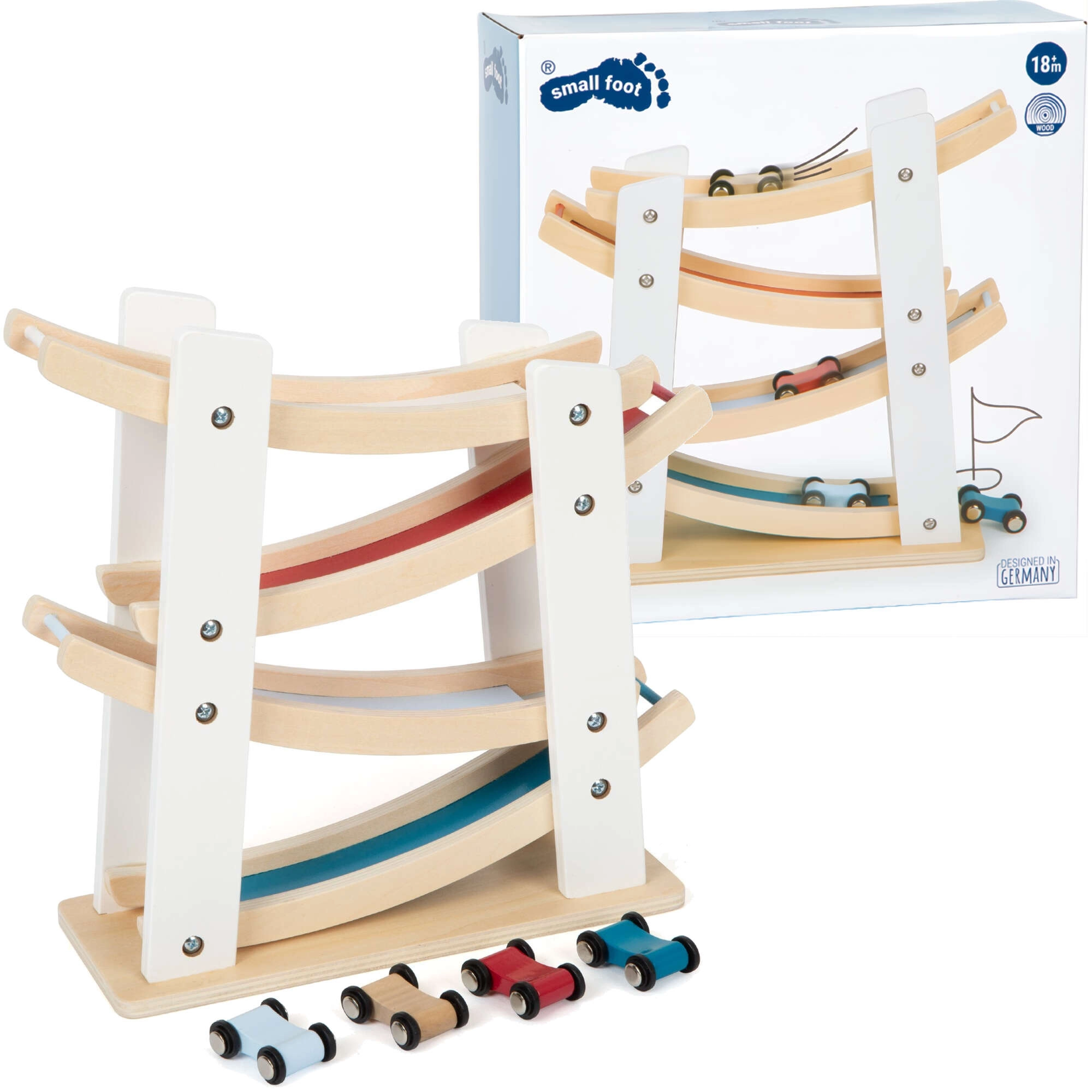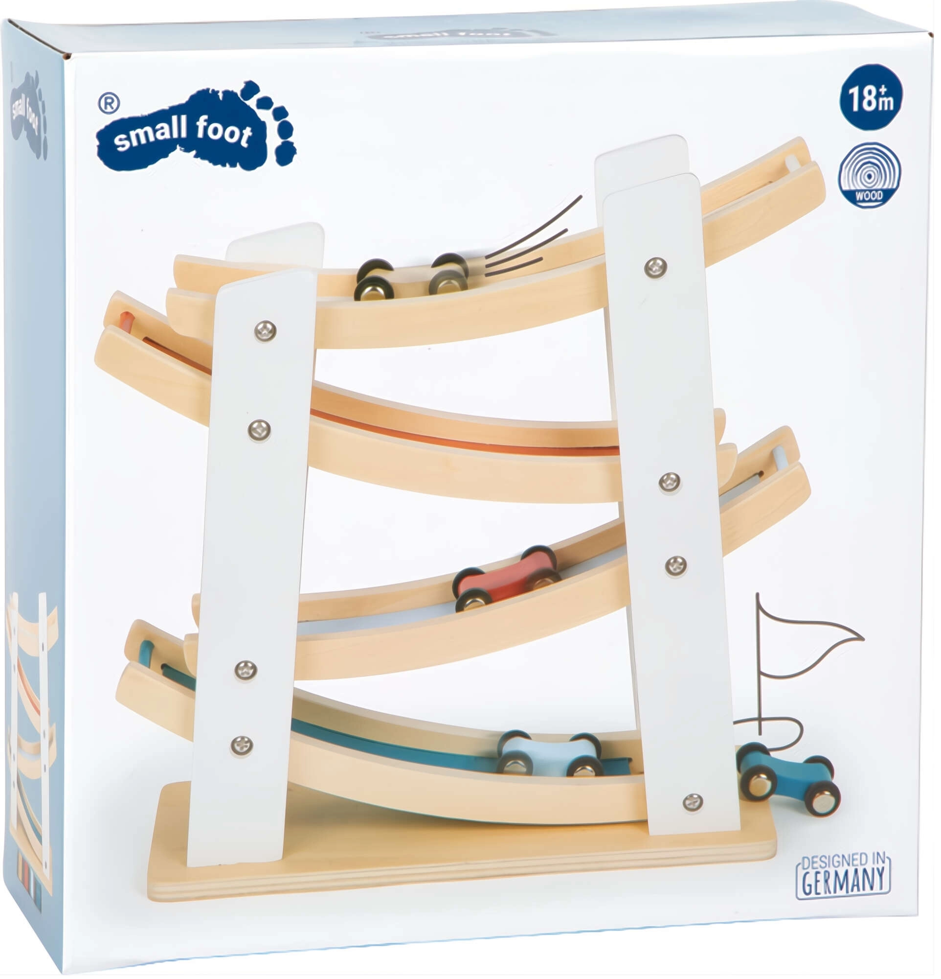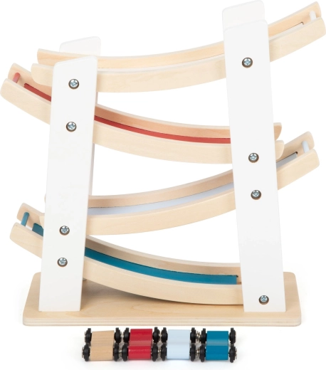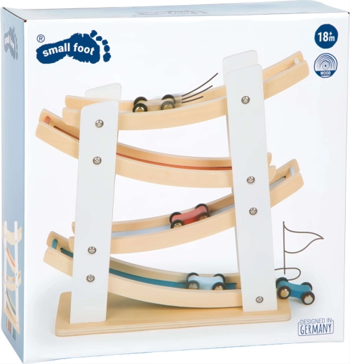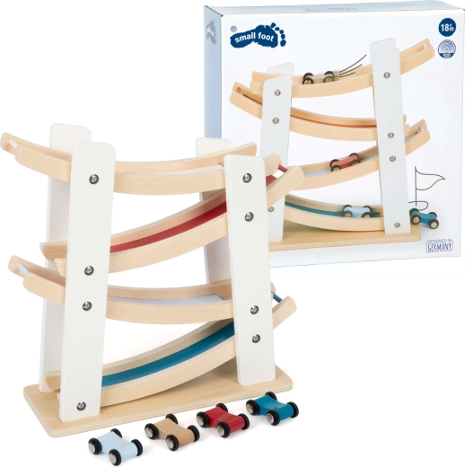 Discover fun for the little ones with the wooden race track with cars from Small Foot. A sturdy construction made of natural wood, four colorful cars, and smooth cascading ramps help develop fine motor skills, hand–eye coordination, and understanding of cause and effect. An ideal toy from 18 months for everyday creative play.