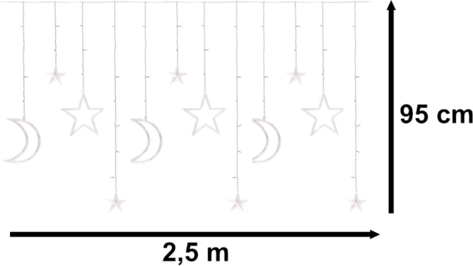 Bring the magic of Christmas into your home with an LED curtain featuring moons and stars. Vibrant diodes and up to 8 lighting modes create a cozy ambiance for winter evenings, family photos, and parties. With a 2.5 m length, 138 LEDs, and mains power, it shines steadily and efficiently.