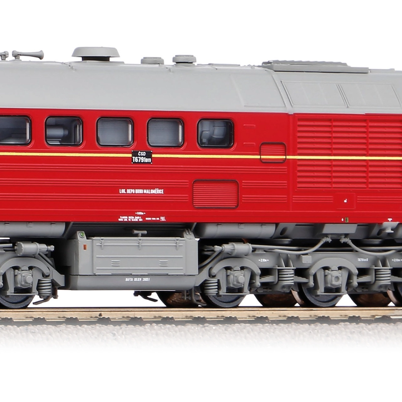 This model of the late series T 679.1, nicknamed "Sergei," is renowned for its precisely crafted construction, especially notable for the chassis detail and painting. The locomotive features characteristic side windows, offering a view into the engine room. The painting includes several chrome elements, allowing the model to perfectly imitate the real-life prototype.
