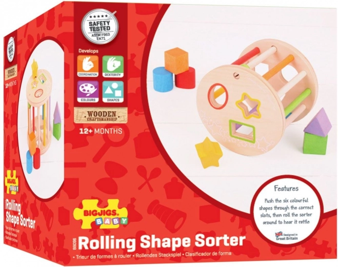 This wooden shape-sorting roller is a great choice for a first educational toy. Colorful geometric pieces fit into matching openings, helping children practice logical thinking, patience, and precise grip. When rolled across the floor, the toy makes pleasant clacking sounds that encourage further exploration.