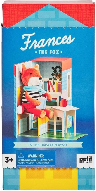 Fox Frances plush by Petit Collage with a library scene and a readable English book. Soft companion, 3D scene, and great play for children aged 3+.