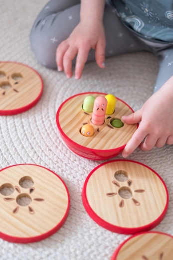 Each level has a different number of holes – children stack the layers so the number matches the peeking worms. A fun path to logical thinking and concentration.