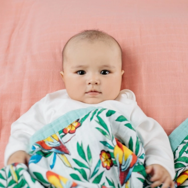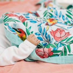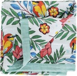 This muslin blanket combines the natural softness of 100% cotton with a breathable multi-layer structure. It’s lightweight, quick-drying, and pleasant to the touch—perfect for everyday use at home and on the go. The generous 106 × 106 cm size offers versatile use.