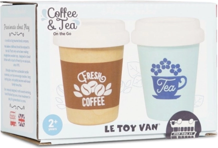 Give kids an authentic pretend-play experience with the coffee & tea to-go set. Two adorable cups with lids and custom prints, “Fresh Coffee” and “Tea,” fit perfectly into any play kitchen or market stall. Thanks to sturdy craftsmanship, they withstand everyday play.