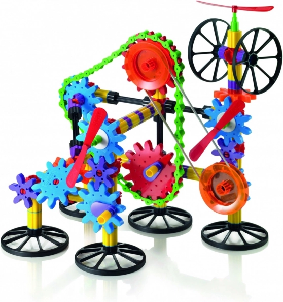 Connect the gears, chain, and elastic belt and watch rotational motion transfer over distance. A great introduction to the world of engineering.