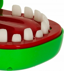 - Players take turns pressing teeth; a random “sore” tooth makes the jaws snap shut
