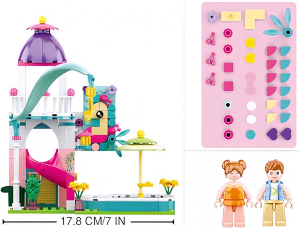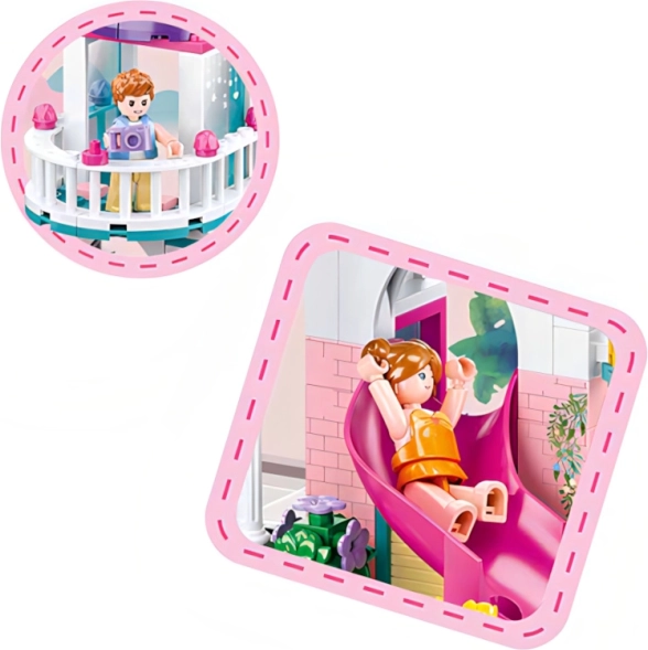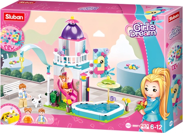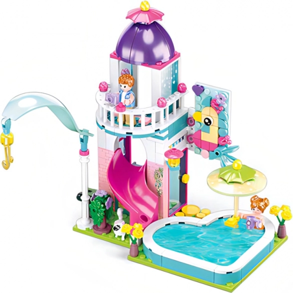 Discover the charm of the Sluban house with a slide into the pool building set with 230 pieces and two figures, designed for medium difficulty. The figures are innovative with movable parts, and the entire set is made from high-quality, non-toxic ABS plastic.