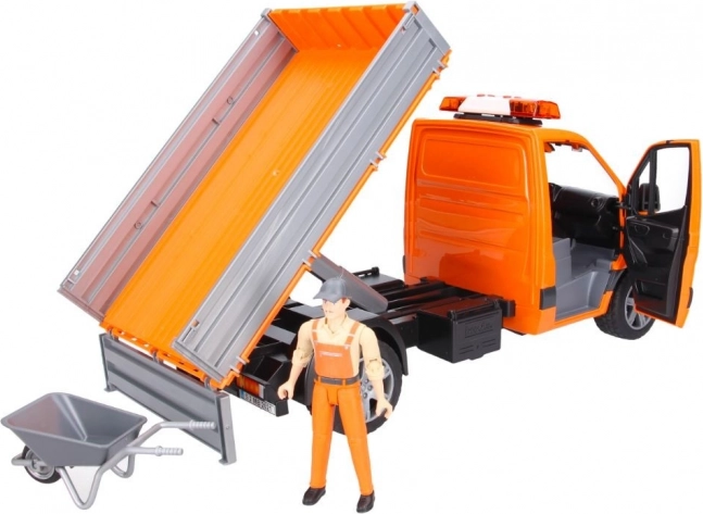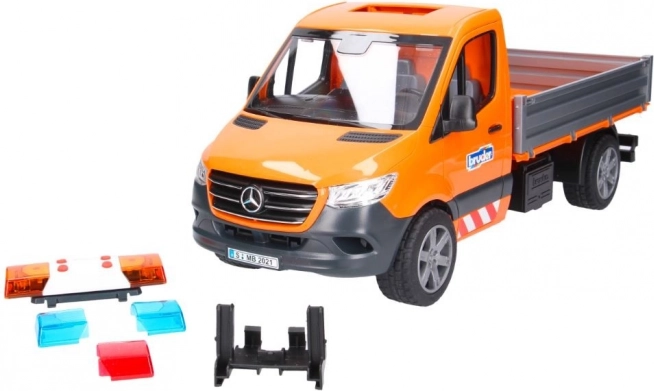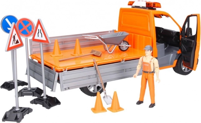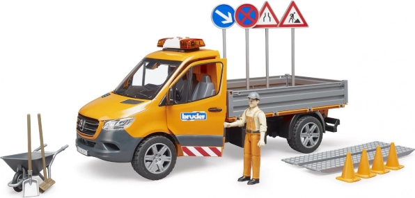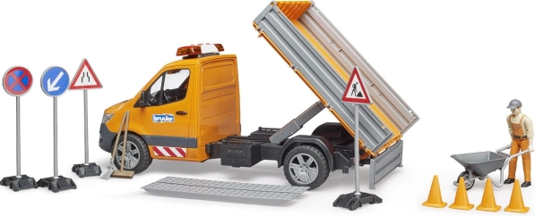 A finely detailed Mercedes‑Benz Sprinter road maintenance model by BRUDER brings light and sound effects, a tipping bed with folding side panels, and rich accessories for realistic play. Includes a road worker figure, loading ramps, signs, and cones. High‑quality ABS plastic, scale 1:16, made in Germany.