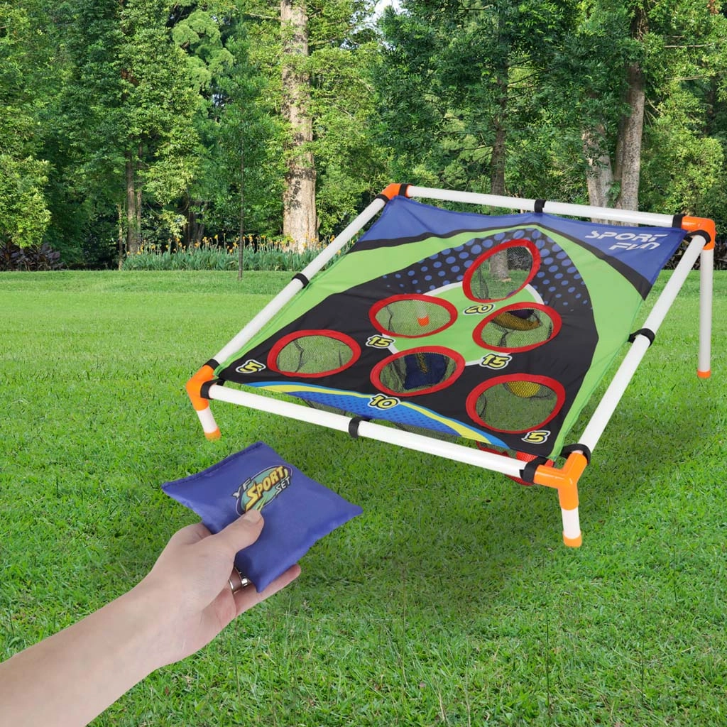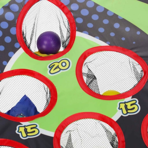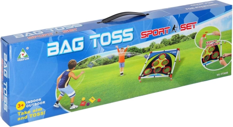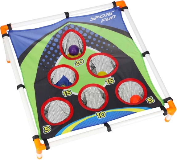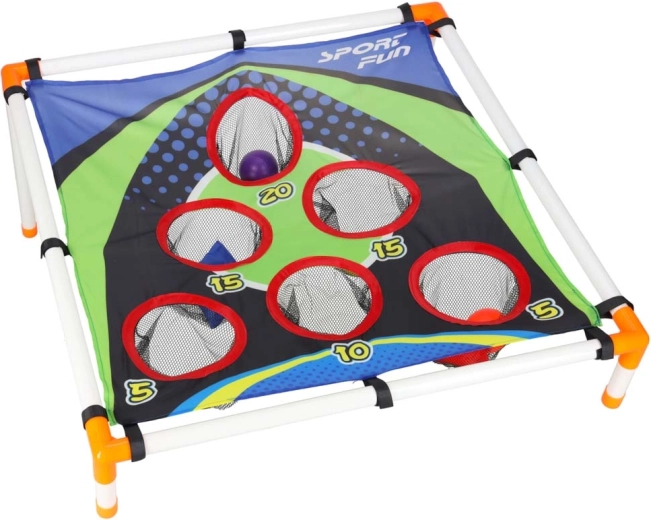 Fun tossing game for kids that develops hand–eye coordination, accuracy, and quick reactions. The lightweight frame with an angled target and numbered holes offers various scoring challenges. Suitable for garden and indoor play, easy to assemble, and simple to carry. Includes tossing beanbags and plastic balls.