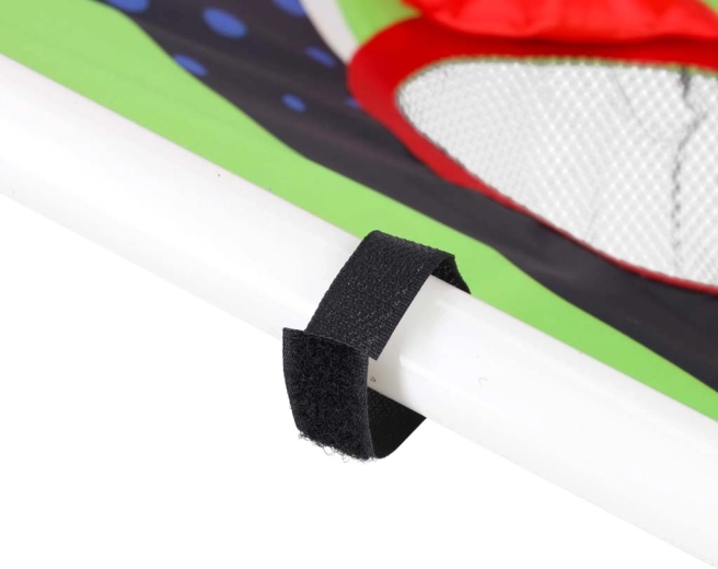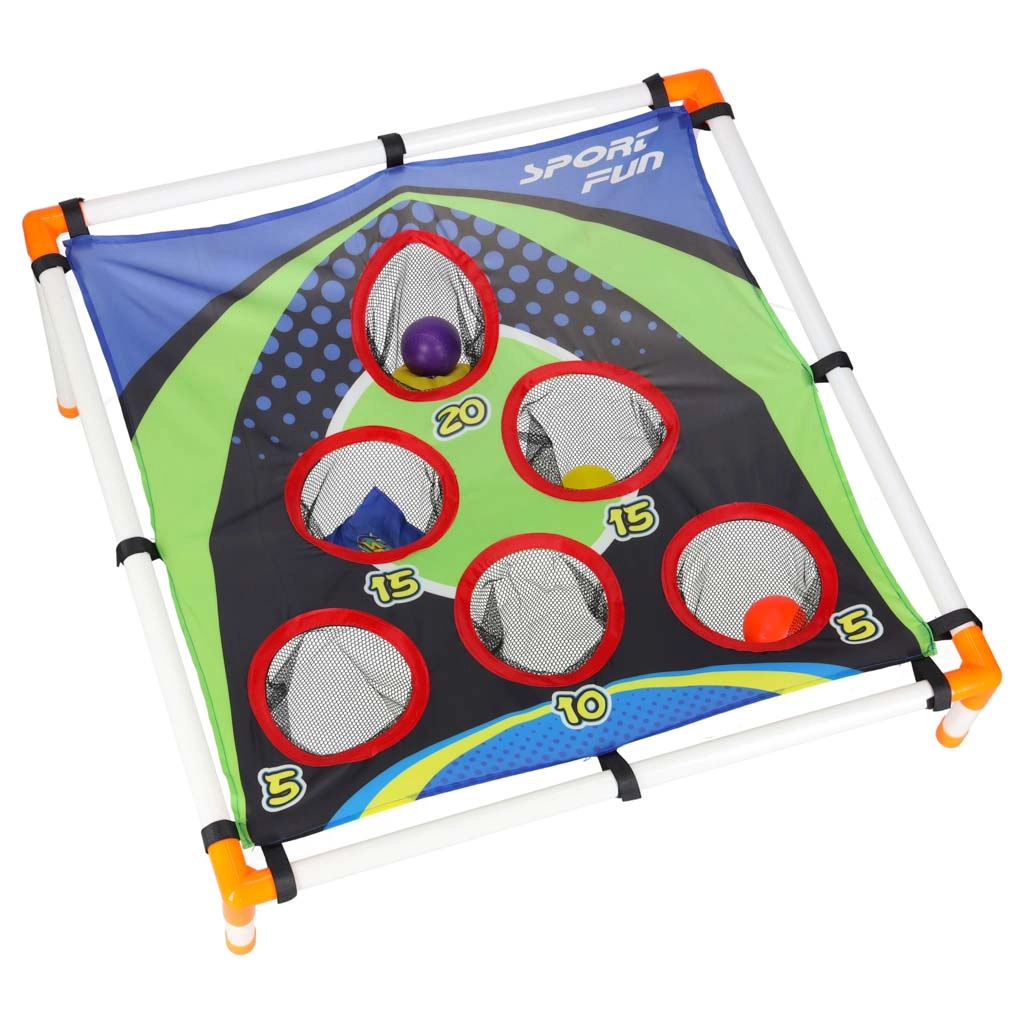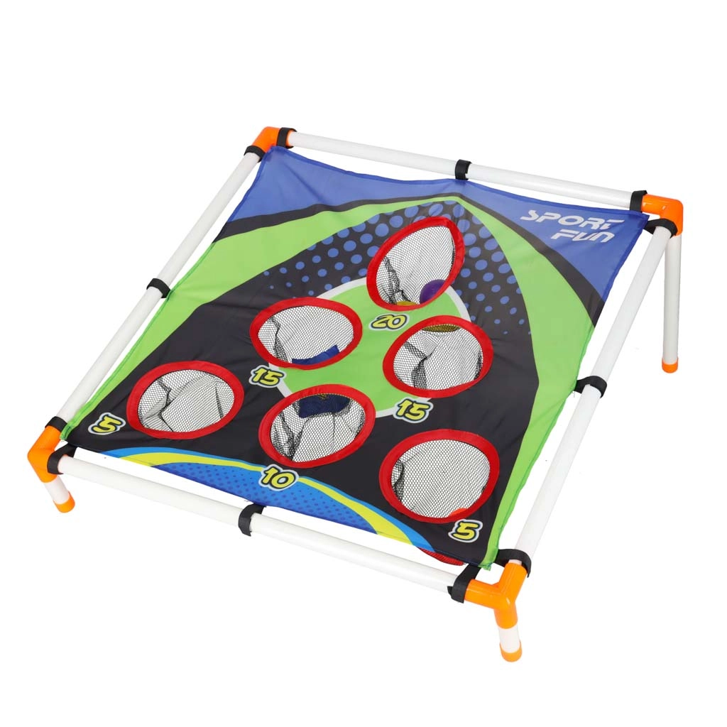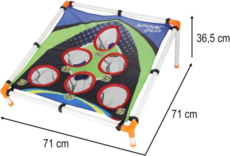 The light frame made of plastic tubes with a tilted stand ensures stability; the durable fabric surface with five to six scoring holes catches beanbags and balls in nets. Assembly is intuitive and the whole setup is easy to take anywhere.