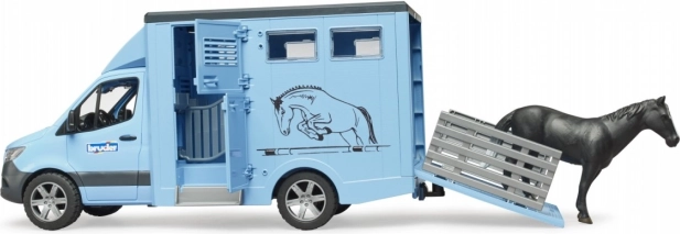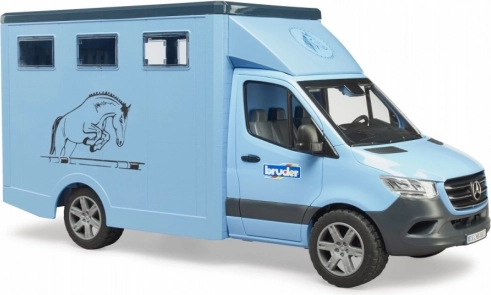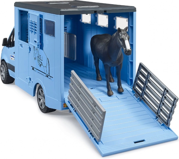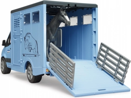 This finely detailed horse transporter is based on the popular MERCEDES‑BENZ Sprinter utility vehicle. Kids will love the functional cab with opening doors, the realistic box body for safe transport, and the abundant play features—from loading via the ramp to a divider configured for two horses.
