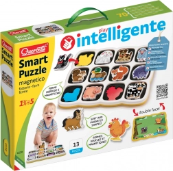 The Quercetti Magnetic Insert Farm is an amazing toy for young children. On one side of the board, children can insert magnets into prepared slots, which helps them develop shape and color recognition. The picture pieces attach easily with magnets and can be stored conveniently for further play.