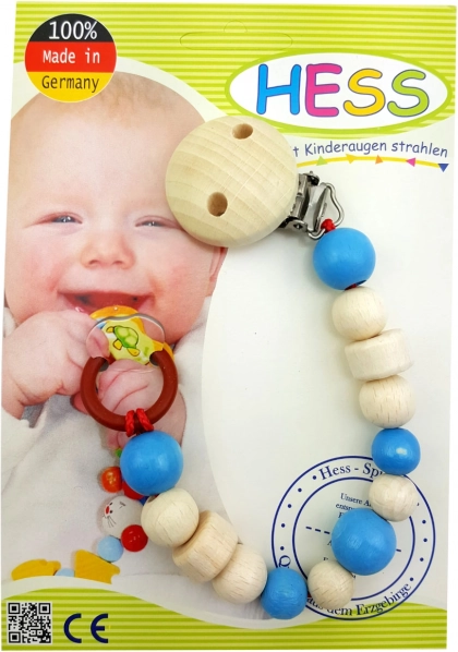 A practical pacifier clip in a soft light blue keeps the pacifier always handy and clean. It features a metal clip for secure attachment to clothing and a universal silicone ring to fit most pacifiers. Made in Germany from high-quality wood with non-toxic paints that are resistant to saliva and sweat.