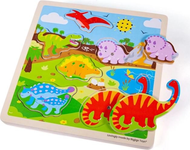 The Dinosaur Puzzle encourages children to learn in a fun way. The wooden pieces are ergonomically designed for easy handling by small hands. Their bright colors and adorable sound effects instantly capture children's attention.