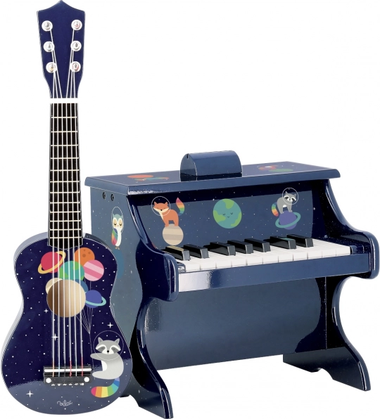 Introducing the Space Guitar, the perfect instrument for young musicians and lovers of space adventures. This children's guitar is made of wood, which ensures quality and durability. Its design is enriched with colorful planetary motifs and an illustration of a raccoon astronomer, making it a true dream toy.