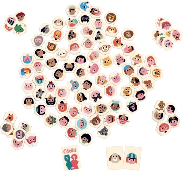 VILAC CÉKIKI is a brisk observation and guessing game with original characters by Swedish illustrator Ingela P. Arrhenius. Lay the wooden picture tiles on the table and try two ways to play: either use clever yes/no questions to guess the secret character, or race to find the matching picture to the flipped card.