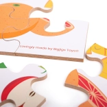 The puzzle features vibrant illustrations that help children visually identify different fruits such as watermelon, orange, and bananas.
