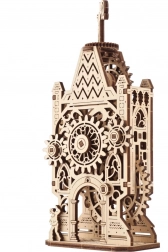 This precisely crafted 3D mechanical kit made of natural plywood is not only decorative but also educational. By turning the large wheel, you set in motion the asynchronous transmission of the clock hands, the pendulum, the weathervane, and other architectural details. The well-thought-out mechanics provide smooth motion and clearly demonstrate how basic clock mechanisms work.